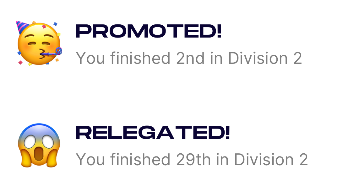 Every week you’ll compete in a 30-man division, attempting to gain promotion to the division above, and avoid relegation to the division below.